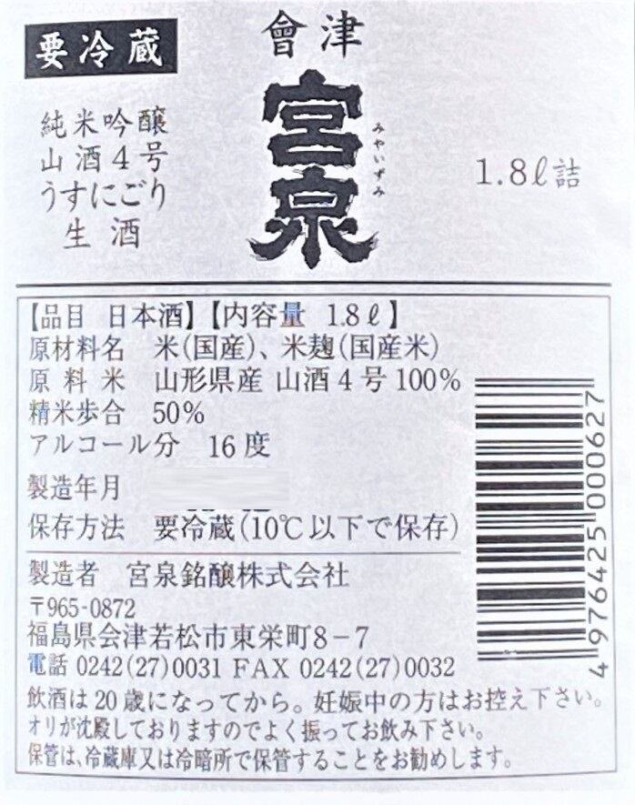 宮泉 純米吟醸”山酒四号”うすにごり生酒 1.8L 【クール便推奨】