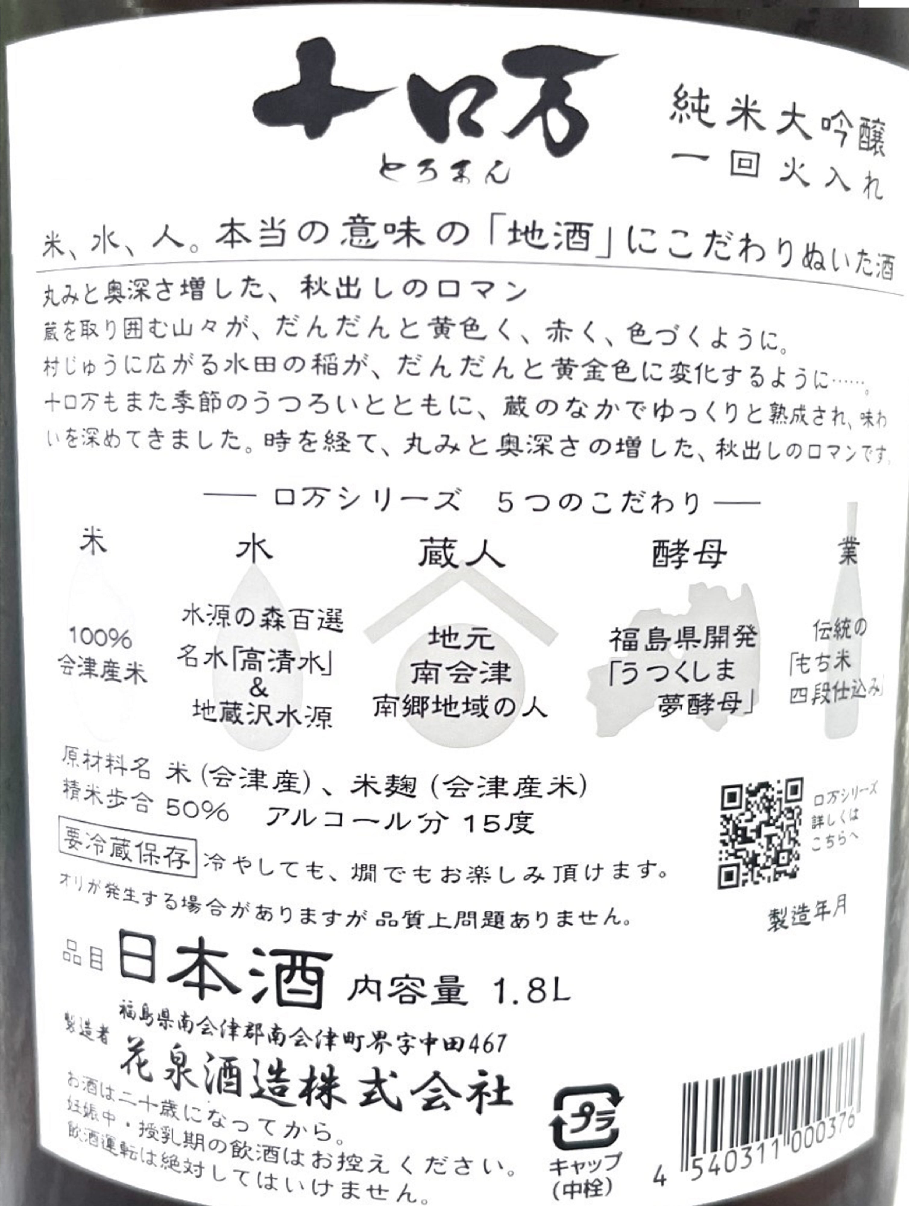 十口万 純米大吟醸酒 1回火入れ 1.8L 【クール便推奨】